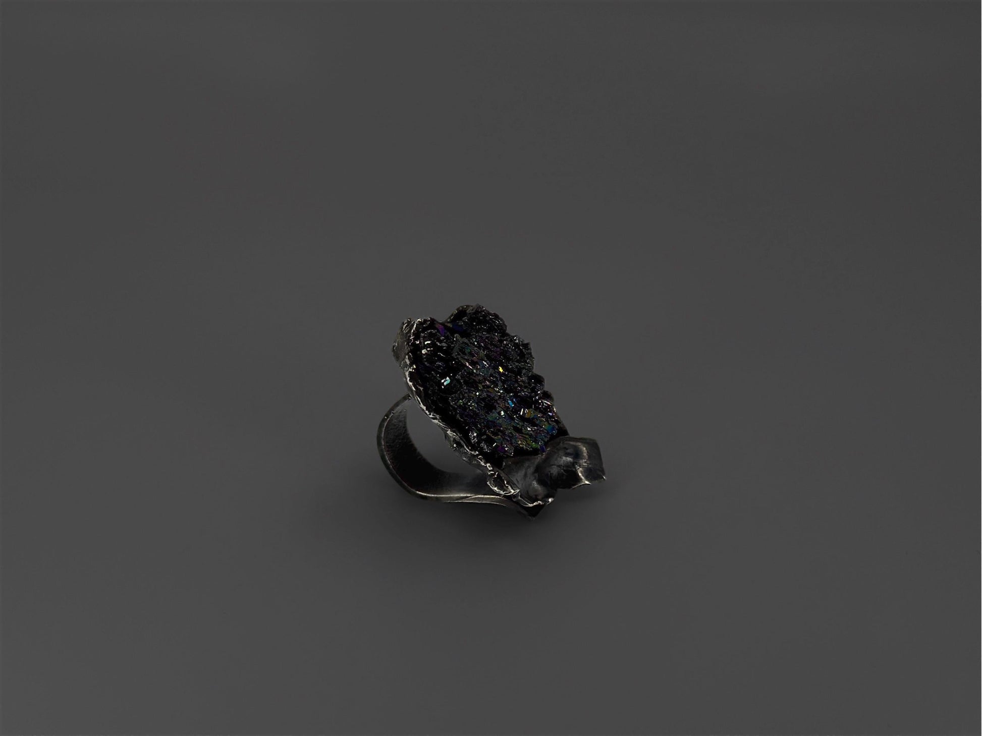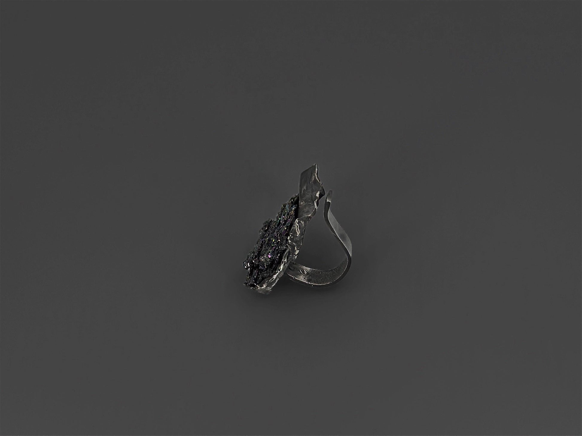 ხელნაკეთი 925 ვერცხლის გახსნილი ბეჭედი შავი კარბორუნდუმის ქვით. ოქსიდირებული (გაშავებული) ვერცხლი.