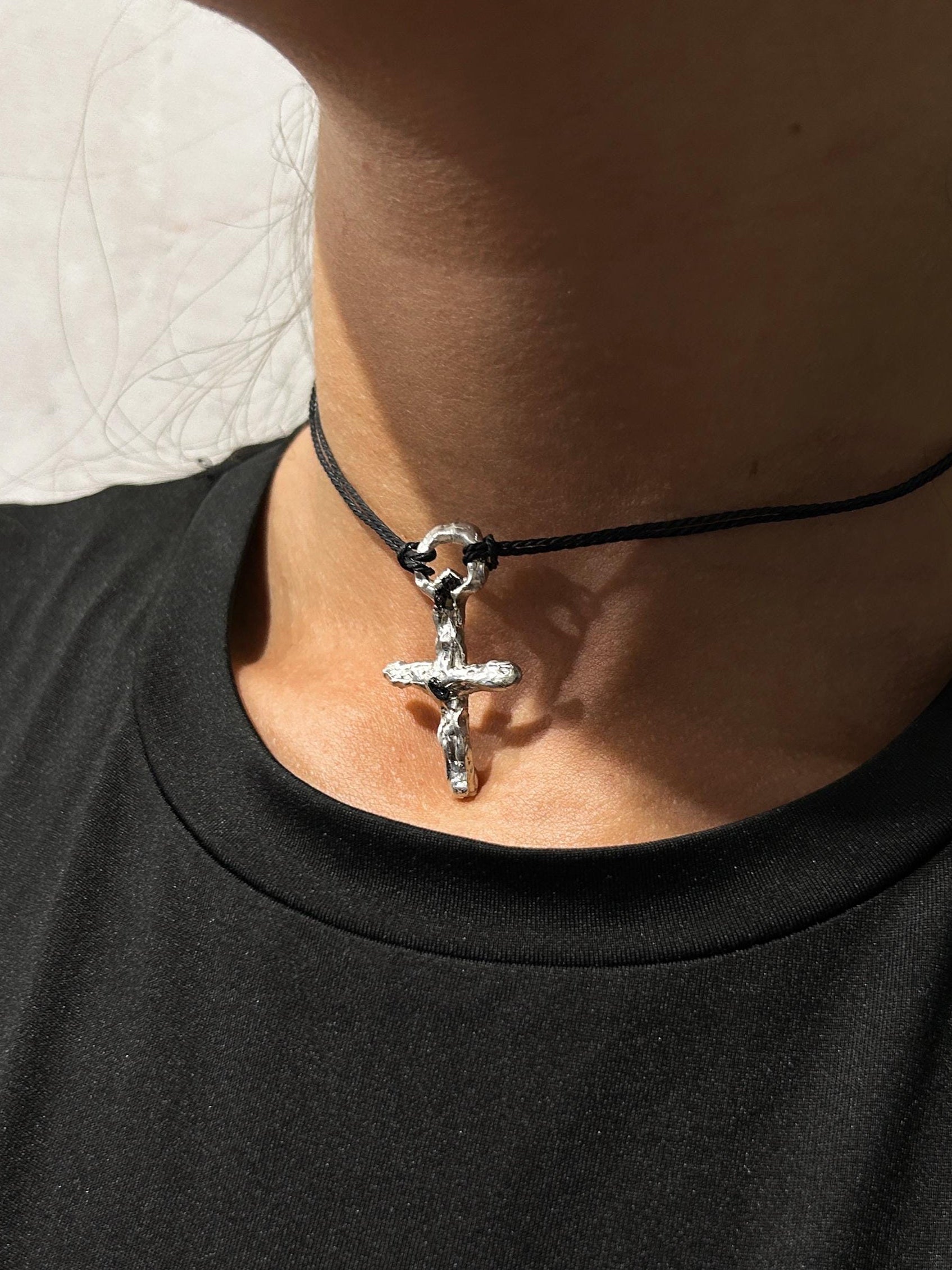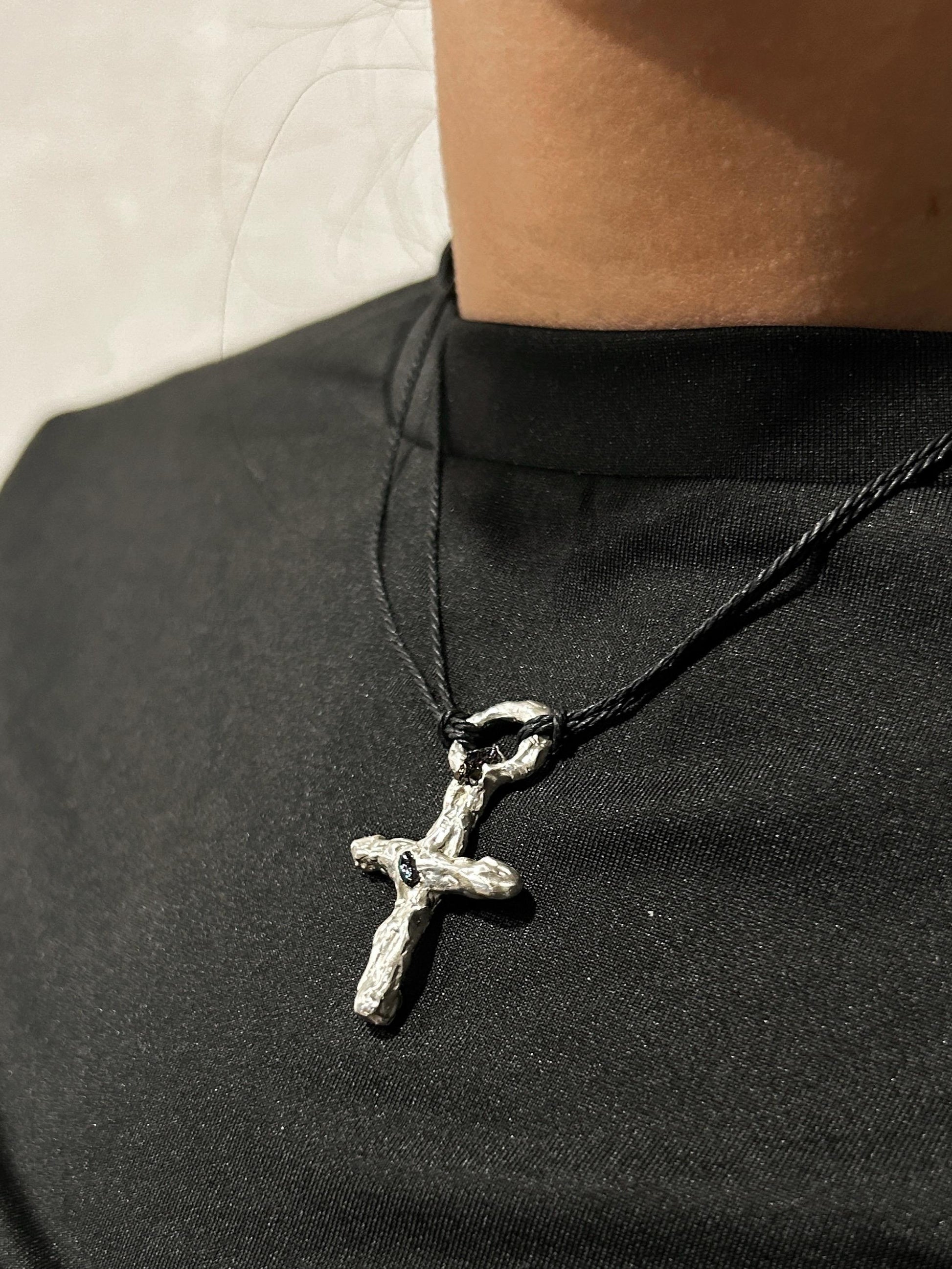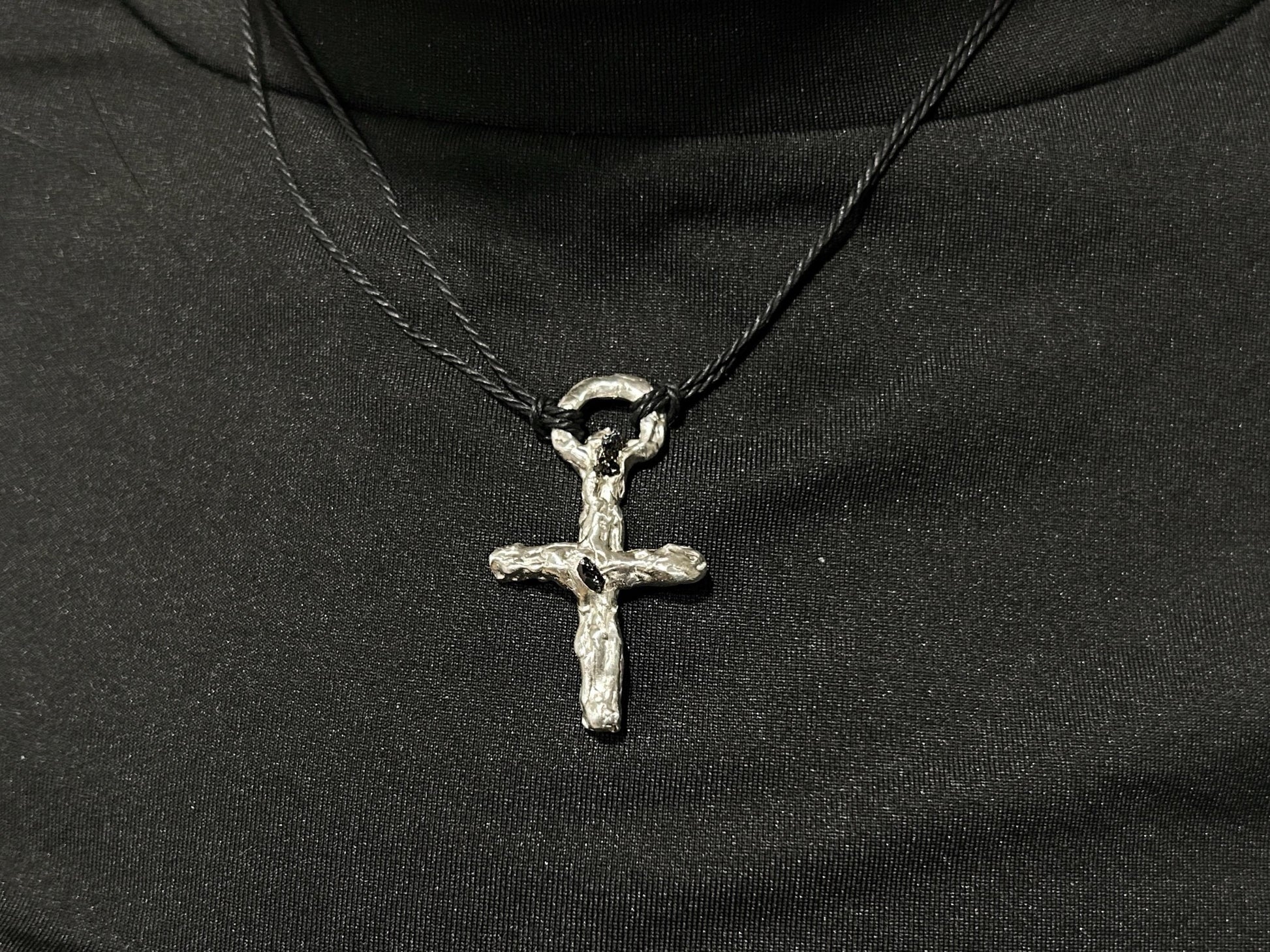 ხელნაკეთი 925 ვერცხლის ჯვარი შავი კარბორუნდუმის ქვით. ოქსიდირებული (გაშავებული) ვერცხლი.