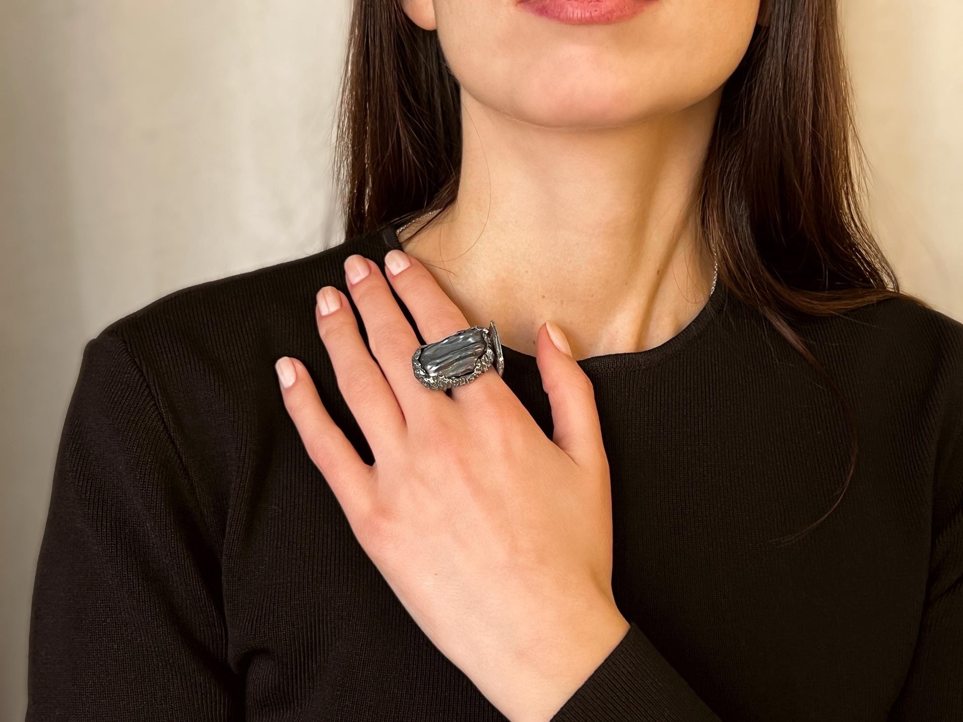 ხელნაკეთი 925 ვერცხლის ბეჭედი ნაცრისფერი მარგალიტით. ოქსიდირებული (გაშავებული) ვერცხლი.