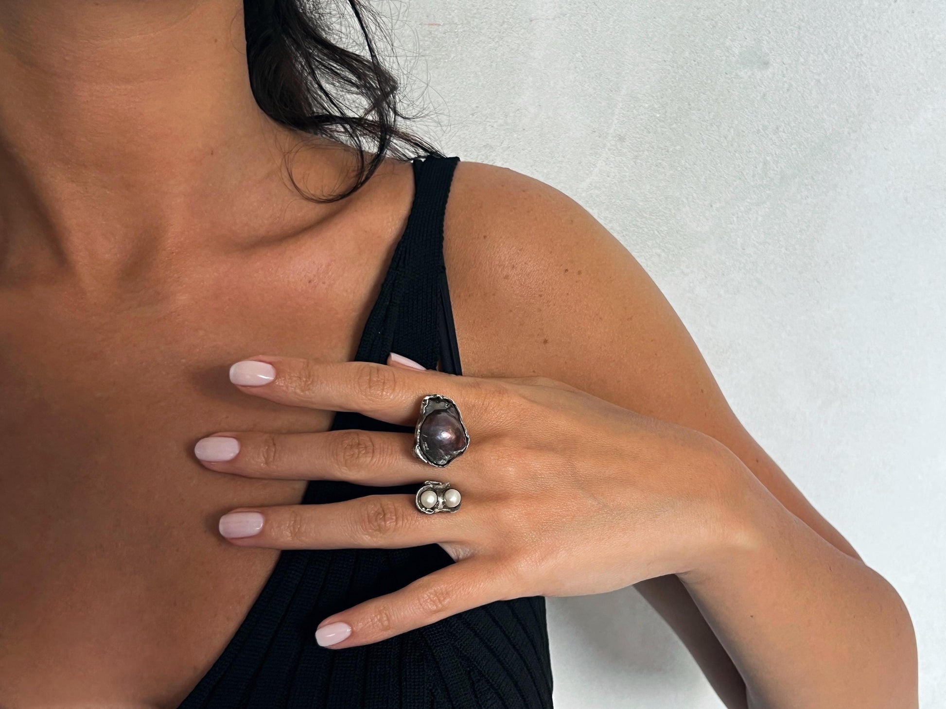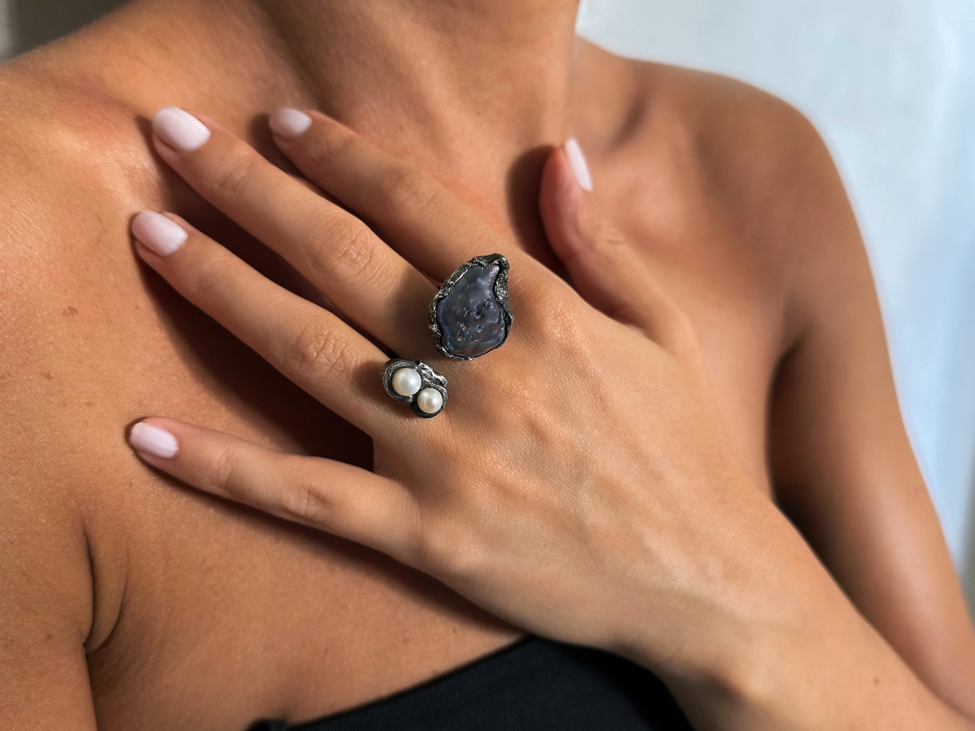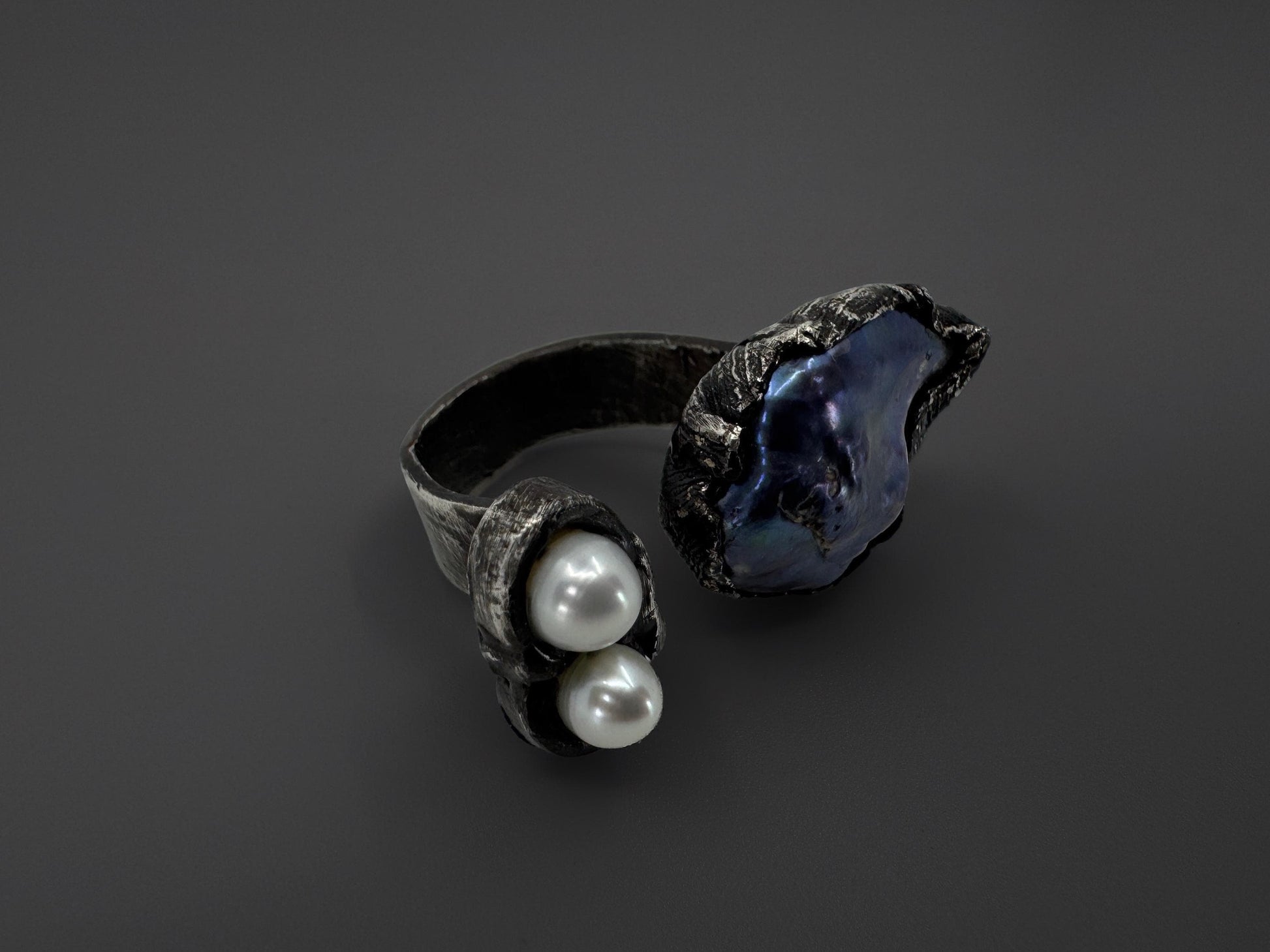 ხელნაკეთი 925 ვერცხლის ღია ბეჭედი სხვადასხვა მარგალიტით. ოქსიდირებული (გაშავებული) ვერცხლი.