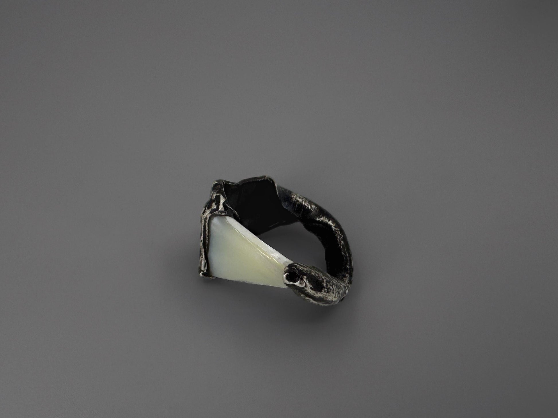 ხელნაკეთი 925 ვერცხლის ბეჭედი თეთრი დედა მარგალიტით. ოქსიდირებული (გაშავებული) ვერცხლი.