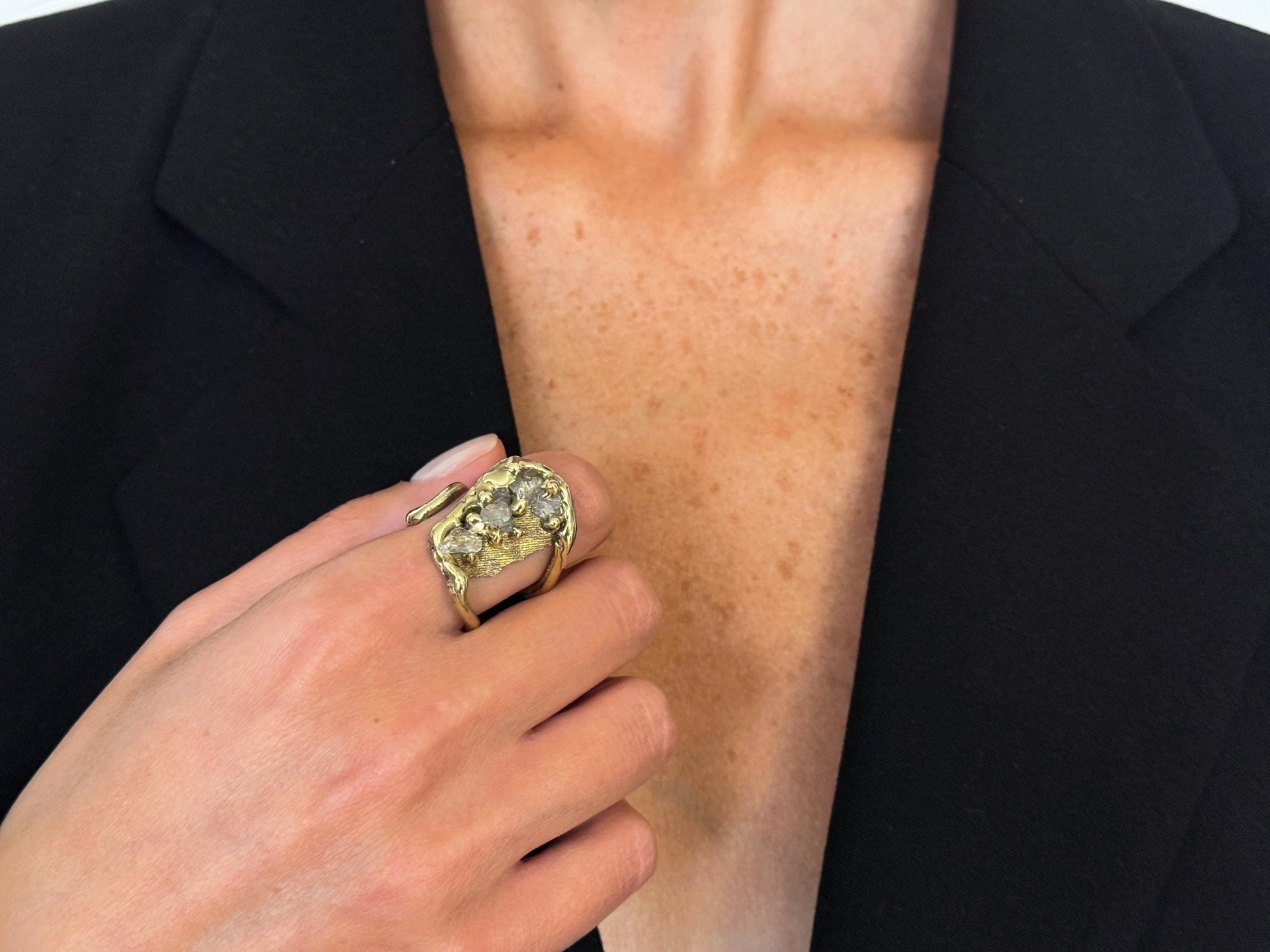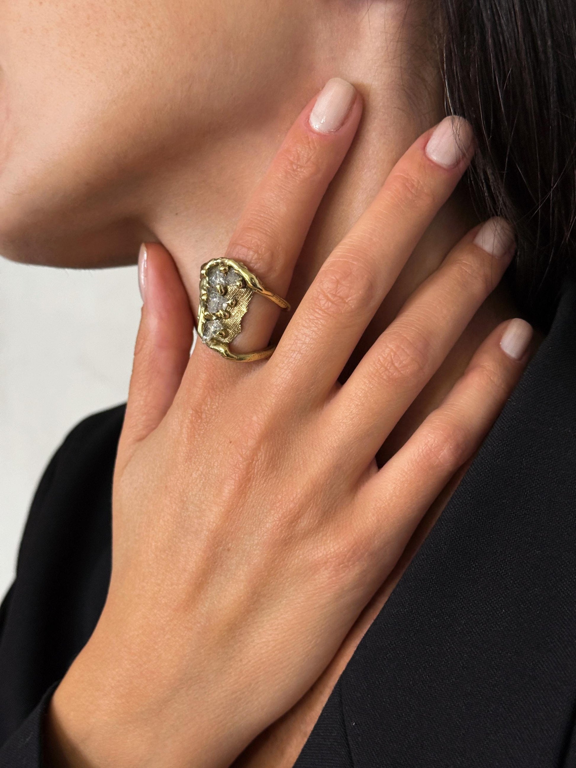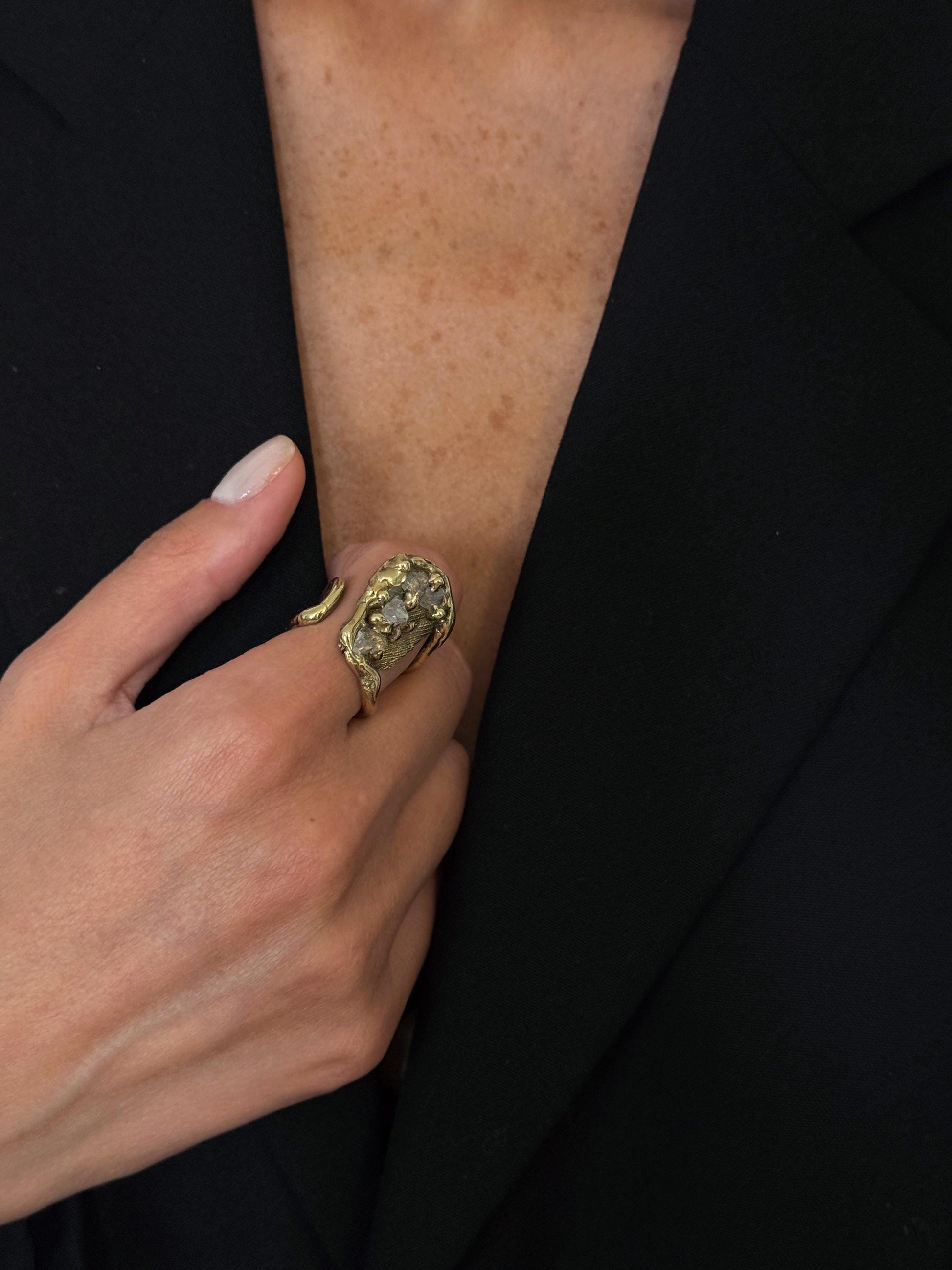 ხელნაკეთი თითბერის ღია ბეჭედი კვარცის კრისტალებით. ხელმისაწვდომია თითბერის მოოქროვილი ვარიანტიც.